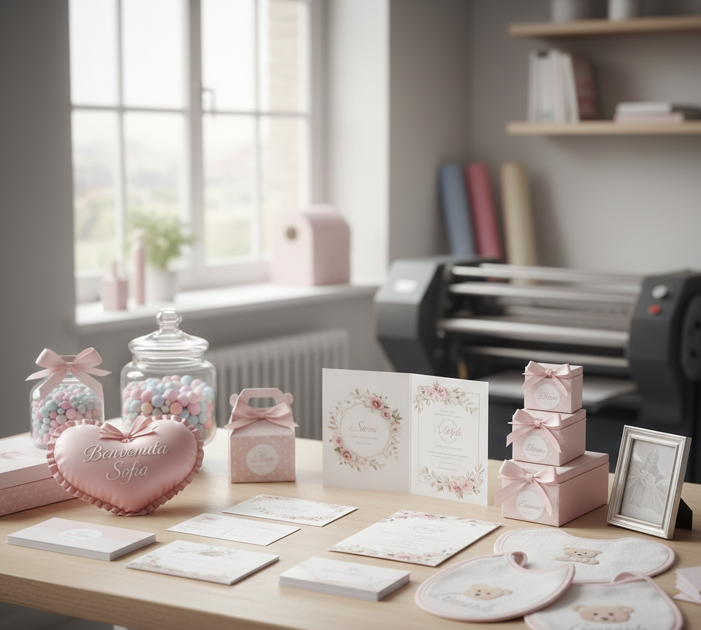La nostra offerta si arricchisce per accogliere con dolcezza ogni nuova vita: realizziamo splendidi fiocchi nascita personalizzati, scatoline per confettate e biglietti coordinati per annunciare l'arrivo più atteso. Grazie alle nostre tecnologie di stampa e ricamo, personalizziamo anche asciugamani e bavette, creando pezzi unici perfetti come regalo o come ricordo speciale del primo corredino.